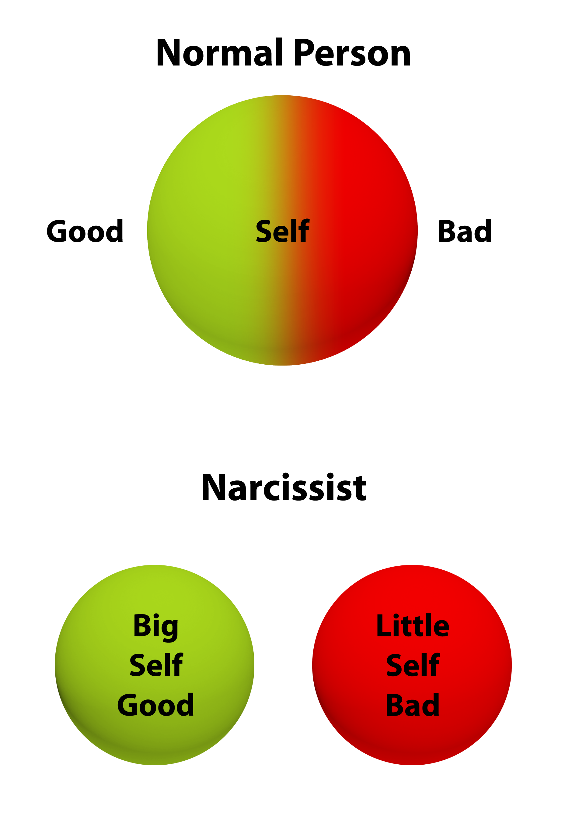 2. The depreciated, ”little” self. Another central theme of the Narcissistic condition, which Otto Kernberg was amongst the first to see, is that the Narcissistic person is really split between two selves: Of course they have the grandiose and perfect “big” self, which is the “default” self that the Narcissist shows the world as a façade. But underneath the big self is a “little” self, which is the shameful and underdeveloped self which led the Narcissist to develop the artificial grander self in the first place.[20] As the psychologist John Berecz has pointed out, the Narcissist’s self-image is therefore “hovering between Hollywood and hobo” – between the grandiose “big” self and the shameful “little” self.[21] In normal people, awareness of the good and bad sides of their person is integrated into their overall sense of self. But in Narcissists (as well as in Borderlines), the good and the bad are polarized into distinct selves which do not speak together and between which there is no middle ground (it’s either Hollywood or hobo).