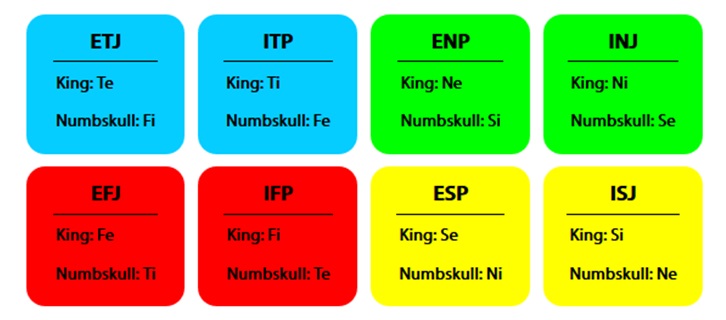 So now we’ve learned that there’s some tension between the king and the Numbskull. In an ENFJ, Feeling is the king and Thinking is the Numbskull. But depending on the type, any function can be the king, and any function can be the Numbskull. No matter which function is the king and the Numbskull, though, those functions will always have some specific characteristics simply because they are the king and the Numbskull: