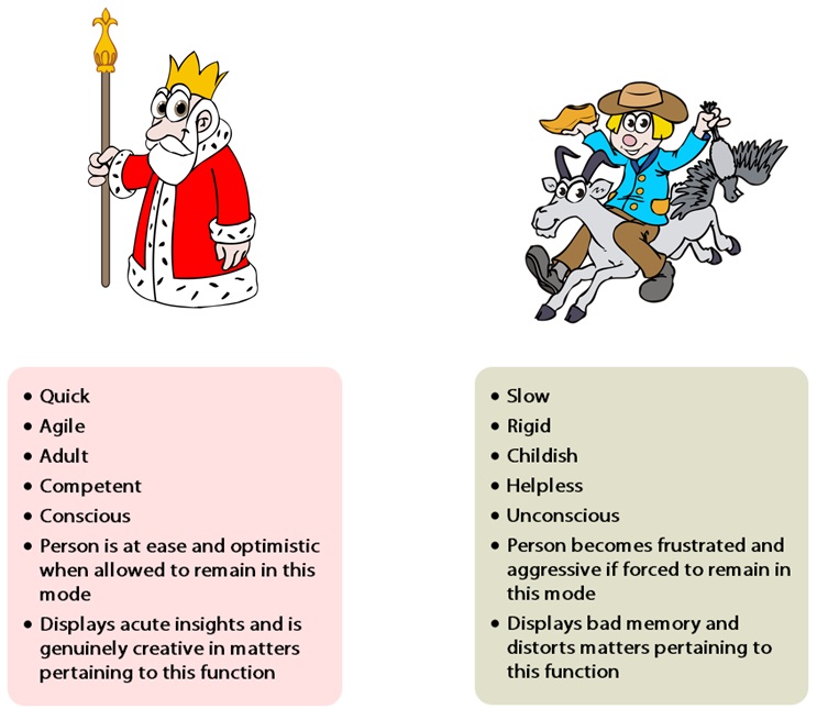 For example, say Fe is the king, and our ENFJ is asked: “So what do you think of the way the USA took care of bin Laden? Do you think they just have the right to barge into another sovereign nation like that? And what about a trial — shouldn’t he have had one?” Then (in our example, at least) the ENFJ cannot access their timid Numbskull mouse Ti then and there — they’d have to be in a safe and quiet environment to do that, and to be able to go slow, so that the inferior function (which resides in the unconscious) may gradually seep up into consciousness. Then our ENFJ could work out what they really think of the way the USA took care of bin Laden, through engaging their Ti and all.