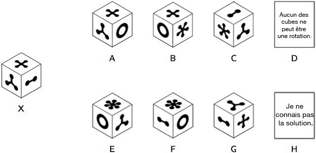 Sélectionnez le choix qui représente une rotation du cube étiqueté X.