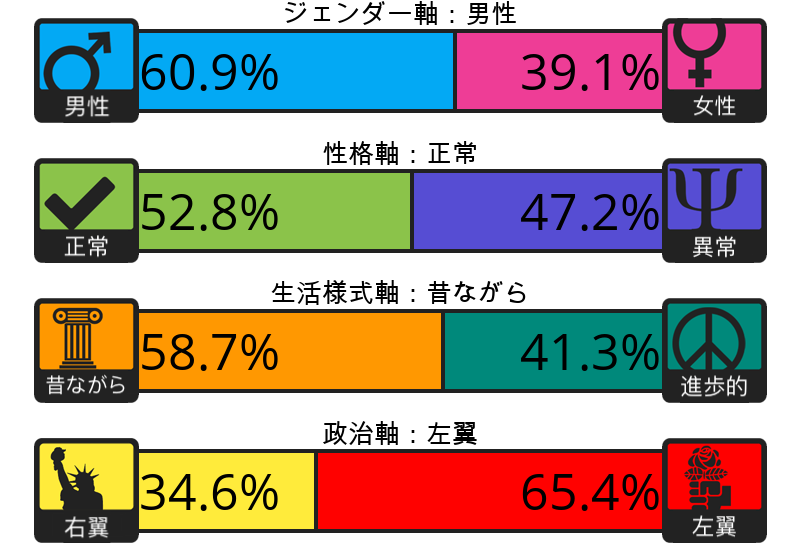 政治軸: 左翼的または右翼的と大まかにコード化された特定の項目を基に、政治観が右翼的か左翼的かどうか測定します。つまりこの軸では、右翼のうち保守派またはリバタリアンか、左翼のうち左翼自由主義者または社会主義者かの分別はされずに、単に左翼的もしくは右翼的な兆候を判断します。政治的座標テスト政治観左翼・右翼テストでは、本テストとは異なる方法で政治観を測定します。これらテストもご覧ください。